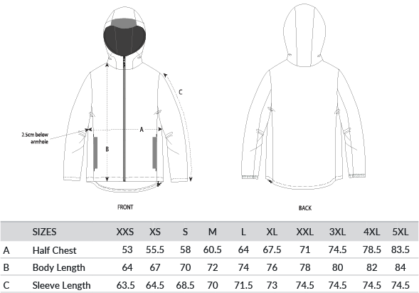 Longer back length with curved hem for protection. Bottom hem and hood with adjustable plastic stopper and elastic cord. Sealed hood visor and sealed welt pockets. Zipped welt pockets with extra grosgrain pull. Self-fabric half-moon at back neck. Inside zip opening at bottom hem and wearer’s left chest for easy decoration. Oeko-Tex certified. Vegan certified. Fairwear Foundation certified.