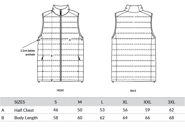 Sleeveless. High collar. Reverse nylon zip at centre front. Zipped welt pockets with extra grosgrain pull. Elastic tape binding at armhole. Fully quilted. Side panels for better shape. Inside seams with binding finish. Bottom hem with adjustable plastic stopper and elastic cord. Global Recycled Standard certified. Vegan certified