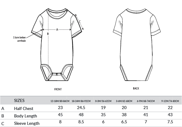 Short sleeve baby bodysuit. Set-in sleeve. 1x1 rib binding at neck collar and leg opening. Snap placket at shoulder. Snap closure at bottom.